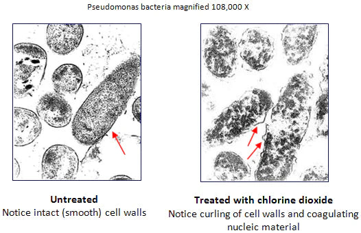 Oxid chloričitý deaktivuje mikroorganismy narušením buněčné stěny bakterií, nebo v případě virů uvolněním virového obalu. Tento účinek nastává okamžitě po kontaktu.